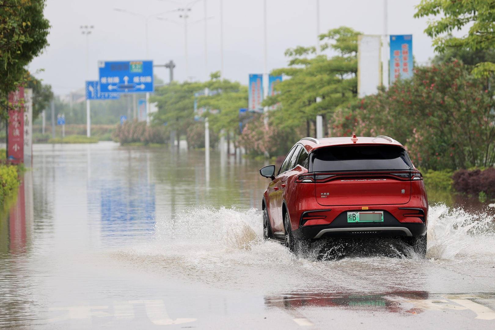 ▲5月16日,广西柳州,市民驾车通过积水路段 图据视觉中国
